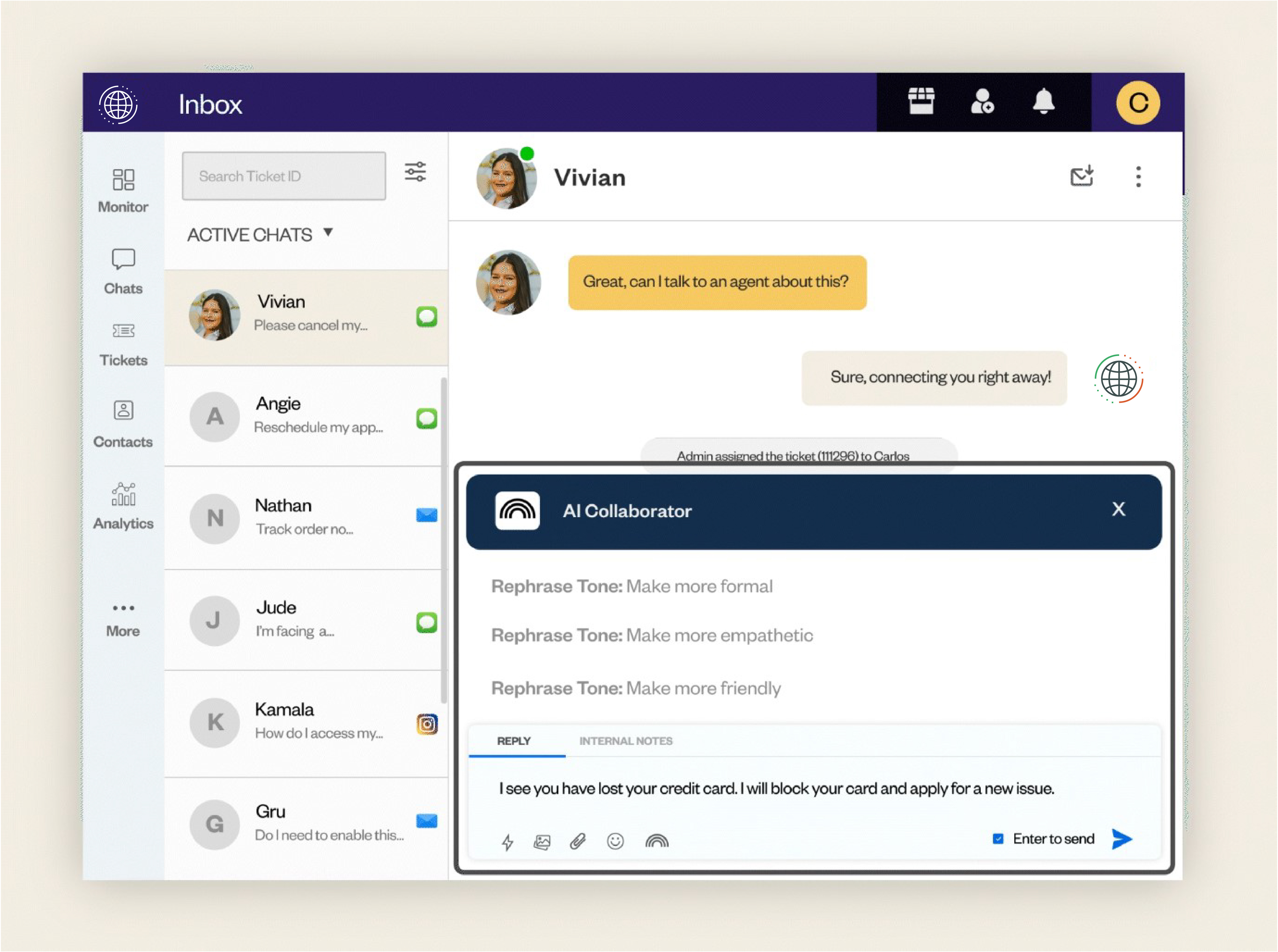 Boost your agents' efficiency with AI-powered chat summaries, response suggestions, and tone adjustments for faster, more effective resolutions.